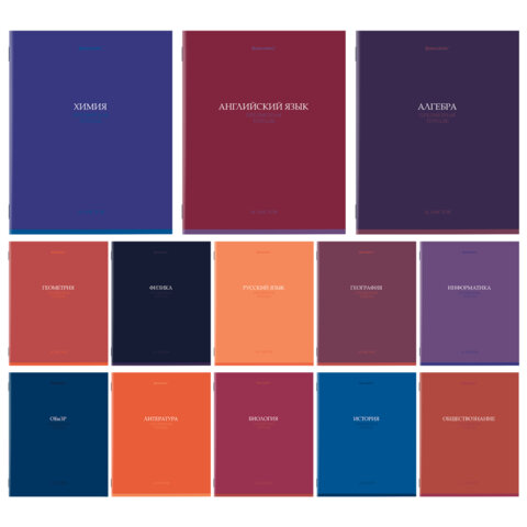 В комплекте 13 тетрадей: Алгебра, Английский язык, Биология, География, Геометрия, Обществознание, История, Информатика, Литература (в линию), Русский язык (в линию), Физика, Химия, ОБиЗР.