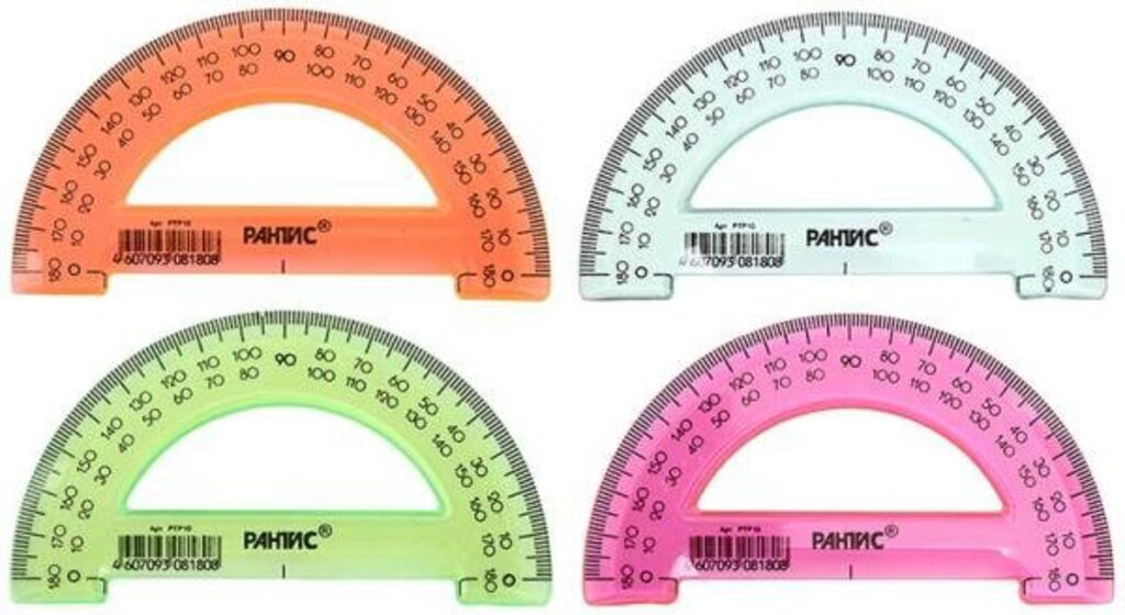 Транспортир 180 градусов, 10см, с чёткой печатной миллиметровой шкалой и фасками. Гладкая глянцевая поверхность. Цвет: 4 ярких цвета ассорти (прозрачные). Штрих-код на единице изделия.