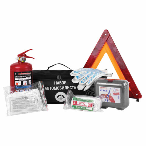 Набор автомобилиста АВТО: аптечка, огнетушитель ОП-2, знак аварийный остановки, трос буксировочный, перчатки с ПВХ, 3757