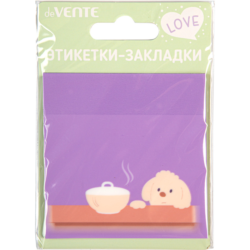 Самоклеящиеся этикетки-закладки "deVENTE. Puppy" пластиковые полупрозрачные, с дизайном, 76x76 мм, 50 листов, печать 4+0, в картонном блистере и пластиковом пакете с европодвесом, сиреневые