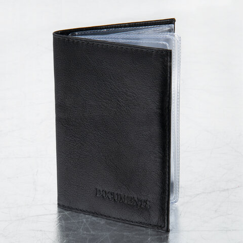 Модель выполнена из натуральной кожи "галант" в черном цвете с надписью "DOCUMENTS". Вмещает в себя 6 пластиковых карманов: 1 файл для водительского удостоверения (60х89 мм), 4 файла размером 80х120 мм (подходят для СТС) и 1 файл для страхового полиса или доверенности формата А5 (150х216 мм) - документ формата А5 подразумевает его складывание пополам лицевой стороной наружу. Дополнительно присутствует карман для пластиковой карты. Компактный размер обложки 95х130 мм позволяет всегда носить с собой нужные автодокументы.