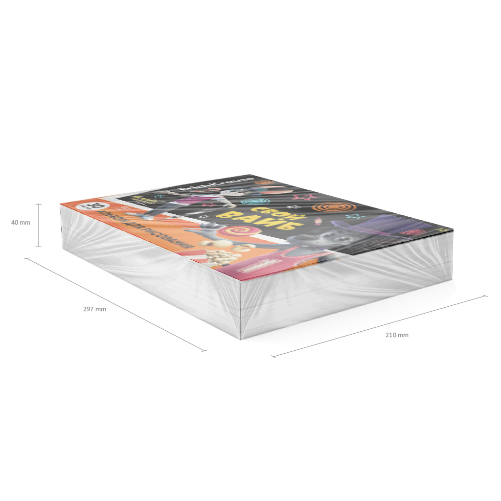 Альбом для рисования формата А4 (297x210 мм). Обложка из высококачественного мелованного картона плотностью 170 г/м2. Жесткая подложка 360 г/м2. В блоке 30 листов. Бумага плотностью 120 г/м2. Белизна бумаги - 100%. Тип скрепления - клей. Альбомы упакованы в термоусадочную пленку по 8 штук.