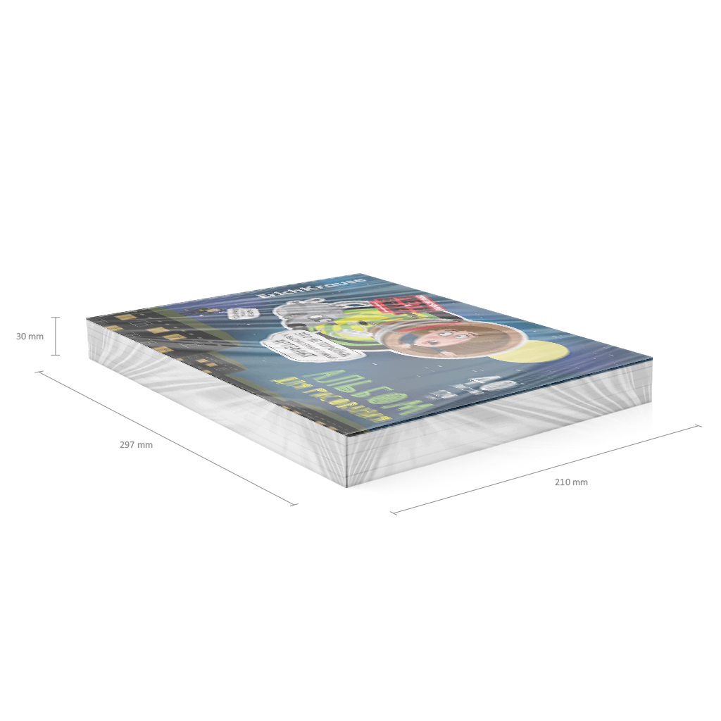 Альбом для рисования формата А4 (210х297 мм). Обложка из высококачественного мелованного картона плотностью 170 г/м2. Жесткая подложка 360 г/м2. В блоке 40 листов. Бумага плотностью 120 г/м2. Белизна бумаги - 100%. Тип скрепления - клей. Альбомы упакованы в термоусадочную пленку по 5 штук.