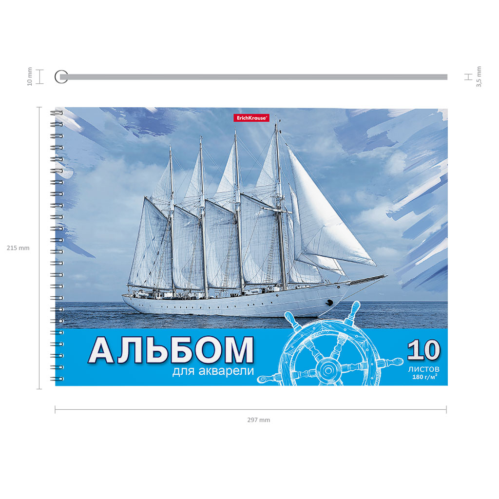 Альбом для рисования формата А4 (210х297 мм). Обложка из высококачественного мелованного картона плотностью 170 г/м2. Жесткая подложка 360 г/м2. В блоке 10 листов бумаги акварельной плотностью 180 г/м2. Специальный рыхлый верхний слой быстро впитывает воду, не позволяя краске растекаться. Белизна бумаги - 100%. Тип скрепления - спираль. Альбомы упакованы в термоусадочную пленку по 10 штук.