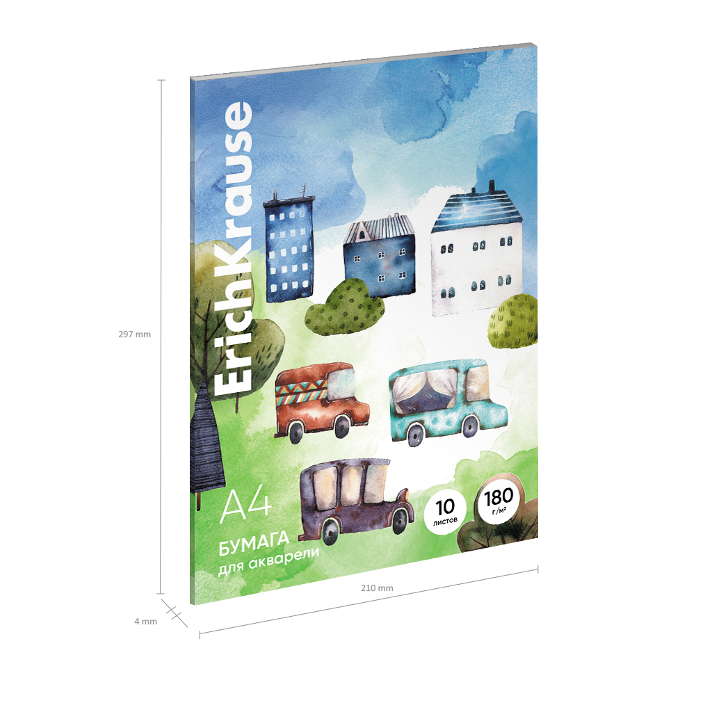 Бумага для акварели формата А4 (210x297). Папка из плотного картона. В блоке 10 листов акварельной бумаги плотностью 180 г/м2. Специальный рыхлый верхний слой быстро впитывает воду, не позволяя краске растекаться. Белизна бумаги 100%.
