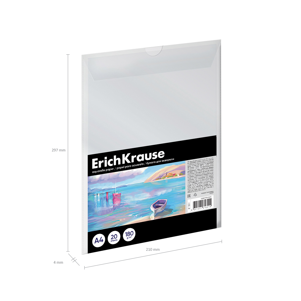 Бумага для акварели формата А4 (210x297). Папка из высококачественного прозрачного пластика. В блоке 20 листов акварельной бумаги плотностью 180 г/м2. Специальный рыхлый верхний слой быстро впитывает воду, не позволяя краске растекаться. Белизна бумаги 100%.