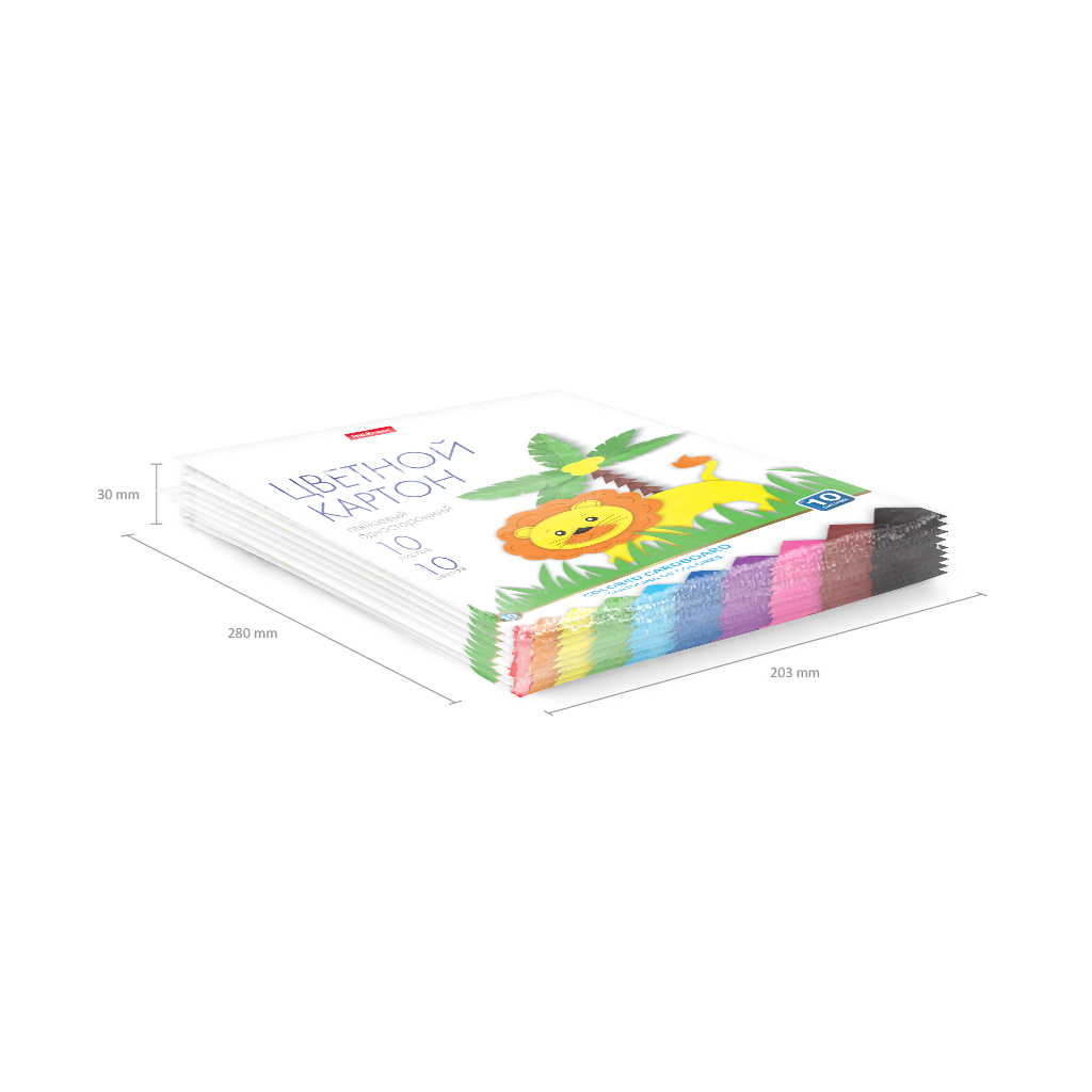Цветной картон глянцевый односторонний формата А4 (203х280 мм). Яркие насыщенные цвета. 10 листов, 10 цветов. Плотность наполнения 170 г/м2. Тип скрепления клей. На внутренней стороне обложки приводятся инструкции по изготовлению поделок. Упакован в термоусадочную пленку по 10 штук.
