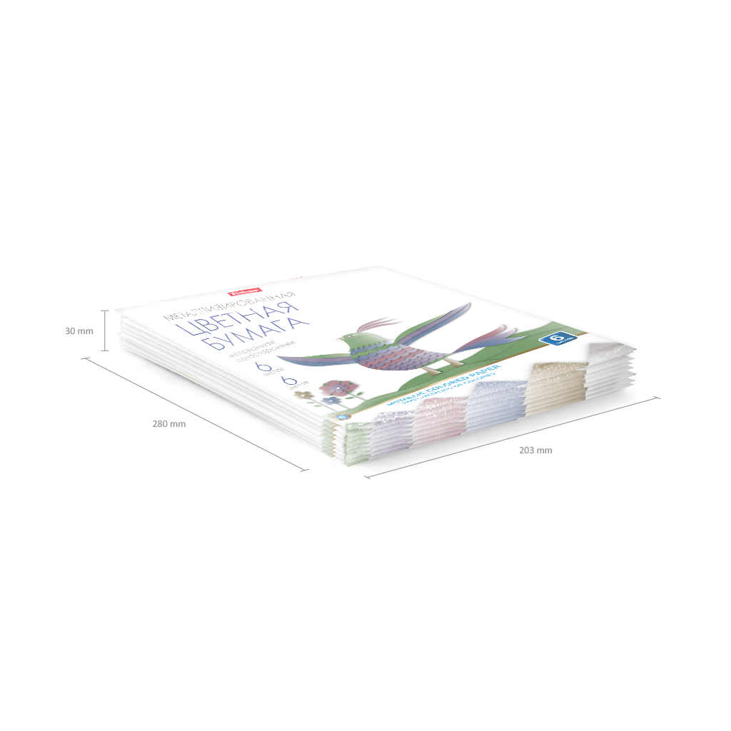Цветная бумага мелованная односторонняя формата А4 (203х280 мм). Глубокие металлизированные цвета. В наборе 6 листов, 6 цветов. Плотность наполнения - 80 г/м2. Папка из плотного картона. Упакована в термоусадочную пленку по 5 штук.