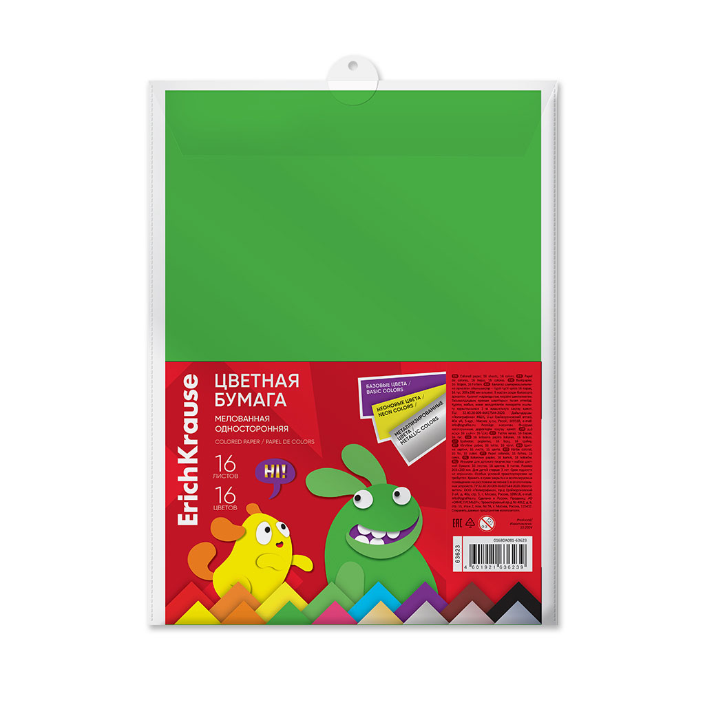 Цветная бумага мелованная односторонняя формата А4 (203х280 мм). В наборе 16 листов: 8 базовых цветов (красный, оранжевый, желтый, зеленый, голубой, фиолетовый, коричневый, черный), 4 металлизированных цветов (золотой, серебряный, розовый, голубой), а также 4 неоновых цветов (желтый, оранжевый, зеленый, ярко-розовый). Плотность наполнения 80 г/м2. Папка из плотного пластика с европодвесом.