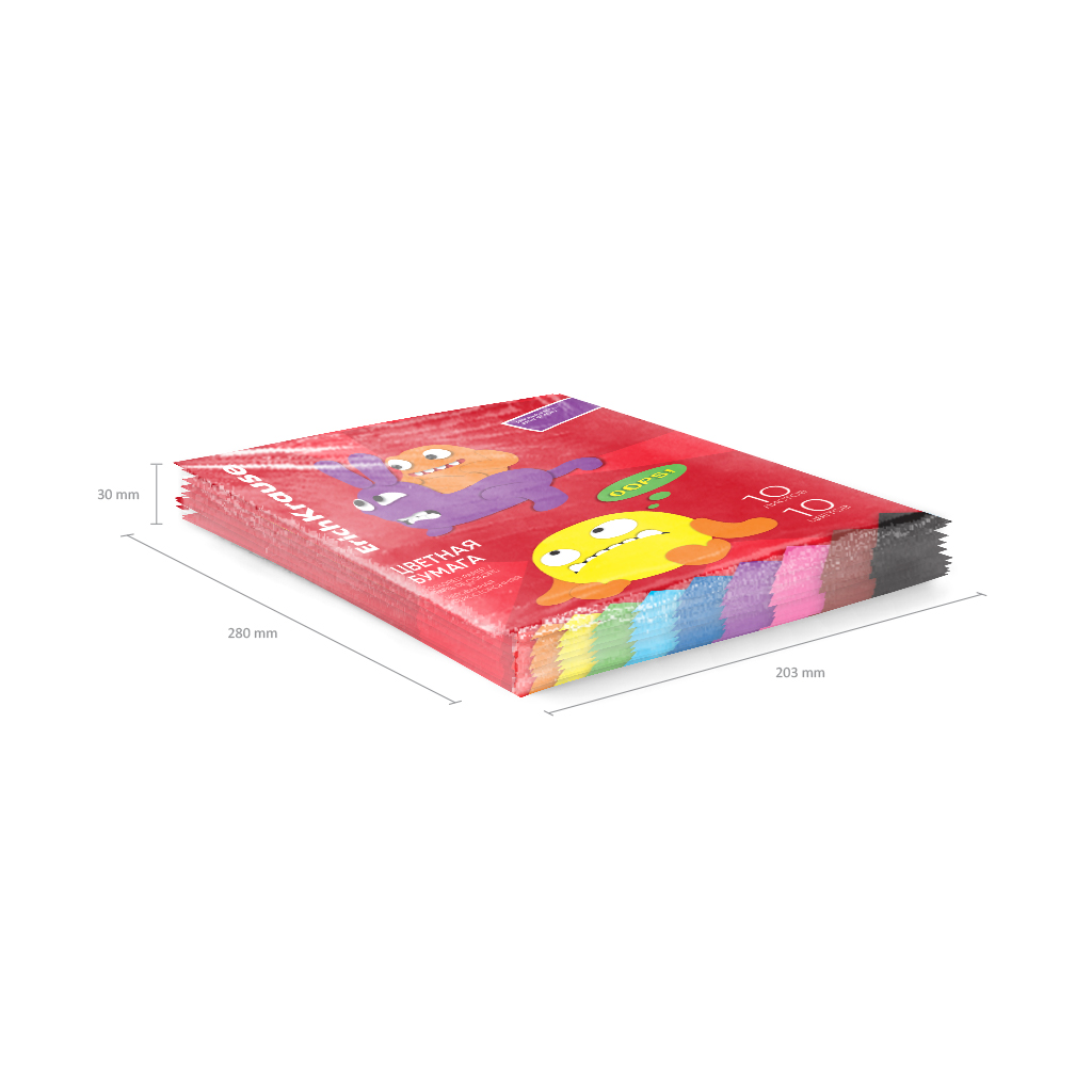 Цветная бумага мелованная односторонняя формата А4 (203х280 мм). В наборе 10 листов 10 базовых цветов (красный, оранжевый, желтый, зеленый, голубой, синий, фиолетовый, розовый, коричневый, черный). Плотность наполнения 80 г/м2. Тип скрепления клей. На внутренней стороне обложки приводятся инструкции по изготовлению поделок. Упакована в термоусадочную пленку по 10 штук.