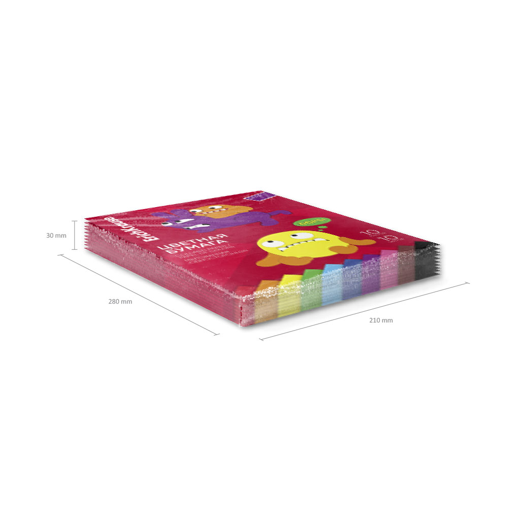Цветная бумага мелованная односторонняя формата А4 (203х280 мм). В наборе 10 листов 10 базовых цветов (красный, оранжевый, желтый, зеленый, голубой, синий, фиолетовый, розовый, коричневый, черный). Плотность наполнения 80 г/м2. Тип скрепления клей. На внутренней стороне обложки приводятся инструкции по изготовлению поделок. Упакована в термоусадочную пленку по 10 штук.