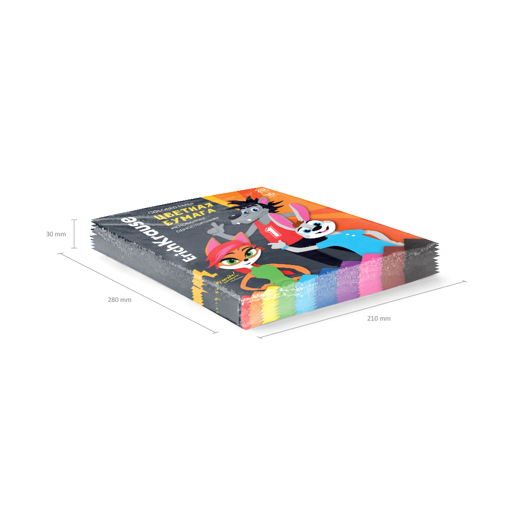 Цветная бумага мелованная односторонняя формата А4 (203х280 мм). В наборе 20 листов 10 базовых цветов (красный, оранжевый, желтый, зеленый, голубой, синий, фиолетовый, розовый, коричневый, черный). Плотность наполнения 80 г/м2. Тип скрепления клей. На внутренней стороне обложки приводятся инструкции по изготовлению поделок. Упакована в термоусадочную пленку по 10 штук.