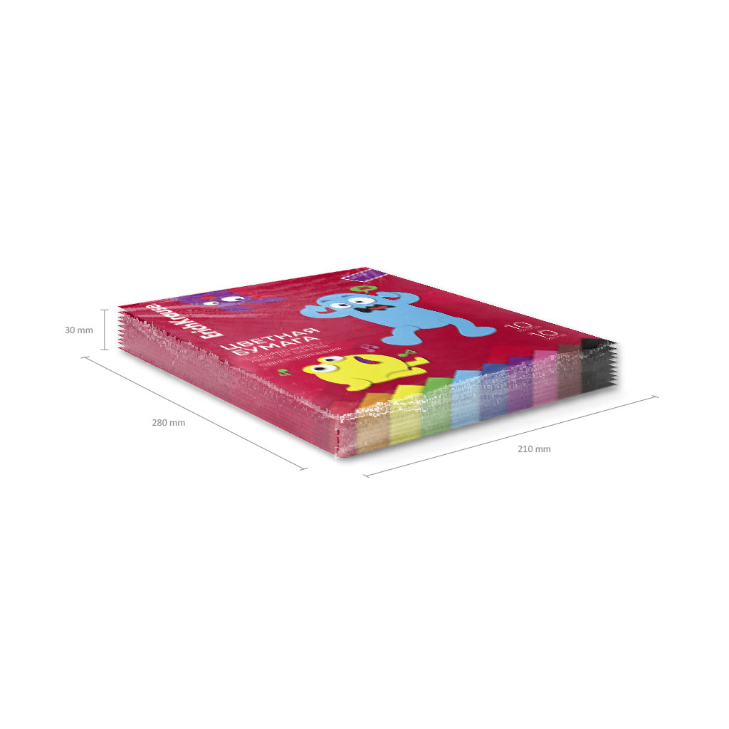 Цветная бумага немелованная односторонняя формата А4 (203х280 мм). В наборе 10 листов 10 базовых цветов (красный, оранжевый, желтый, зеленый, голубой, синий, фиолетовый, розовый, коричневый, черный). Плотность наполнения 80 г/м2. Тип скрепления клей. На внутренней стороне обложки приводятся инструкции по изготовлению поделок. Упакована в термоусадочную пленку по 10 штук.