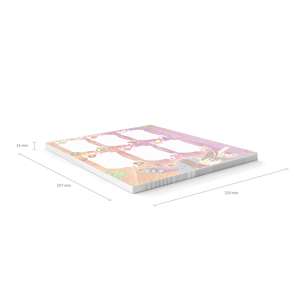 Расписание уроков формата А4 (210х297 мм). Плотный мелованный картон 170 г/м2. Шестидневная учебная неделя. Каждый день содержит 8 строк для записи. Расписания уроков упакованы в термоусадочную пленку по 100 штук.