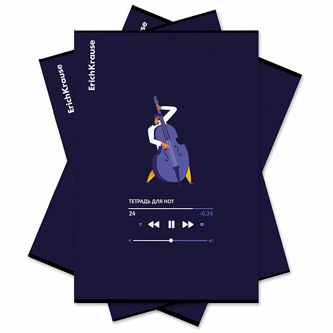 Тетрадь для нот формата А4 (210x297 мм). Ориентация - вертикальная. Обложка из высококачественного мелованного картона плотностью 170 г/м2. В блоке 24 листа. Бумага офсетная плотностью 65 г/м2. Цвет линовки - черный. Тип скрепления - скоба. Имеет справочный материал. Тетради разного дизайна упакованы в термоусадочную пленку по 3 штуки.