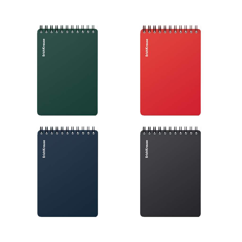 Блокнот формата А7 (76х107 мм). Обложка из высококачественного износостойкого матового пластика с фактурой песок. В блоке 80 листов в клетку. Бумага офсетная плотностью 60 г/м2. Цвет линовки - синий. Скругленные уголки обложки. Тип скрепления - спираль. Блокноты разного цвета упакованы в термоусадочную пленку по 4 штуки.