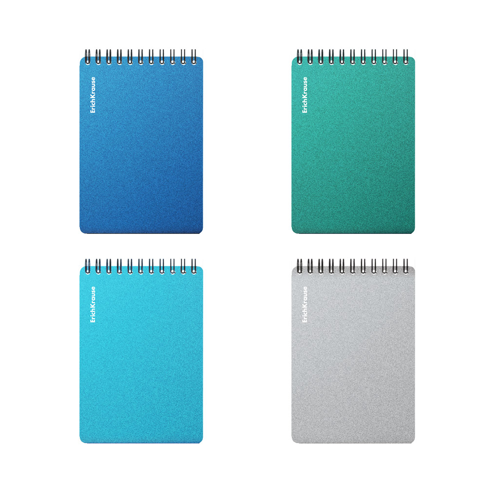 Блокнот формата А6 (102х146 мм). Обложка из высококачественного износостойкого матового пластика с фактурой песок. В блоке 80 листов в клетку. Бумага офсетная плотностью 60 г/м2. Цвет линовки - синий. Скругленные уголки обложки. Тип скрепления - спираль. Блокноты разного цвета упакованы в термоусадочную пленку по 4 штуки.
