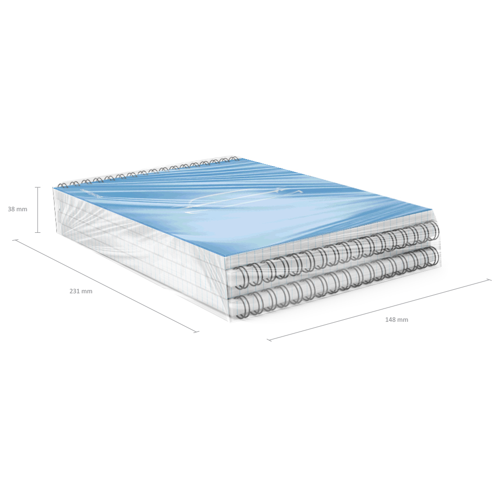 Блокнот формата А5 (148х210 мм). Обложка из высококачественного износостойкого матового пластика с фактурой песок. Стильный дизайн выполнен печатью белой краской. В блоке 80 листов в клетку. Бумага офсетная плотностью 60 г/м2. Цвет линовки - синий. Скругленные уголки обложки. Тип скрепления - спираль. Блокноты упакованы в термоусадочную пленку по 4 штуки.