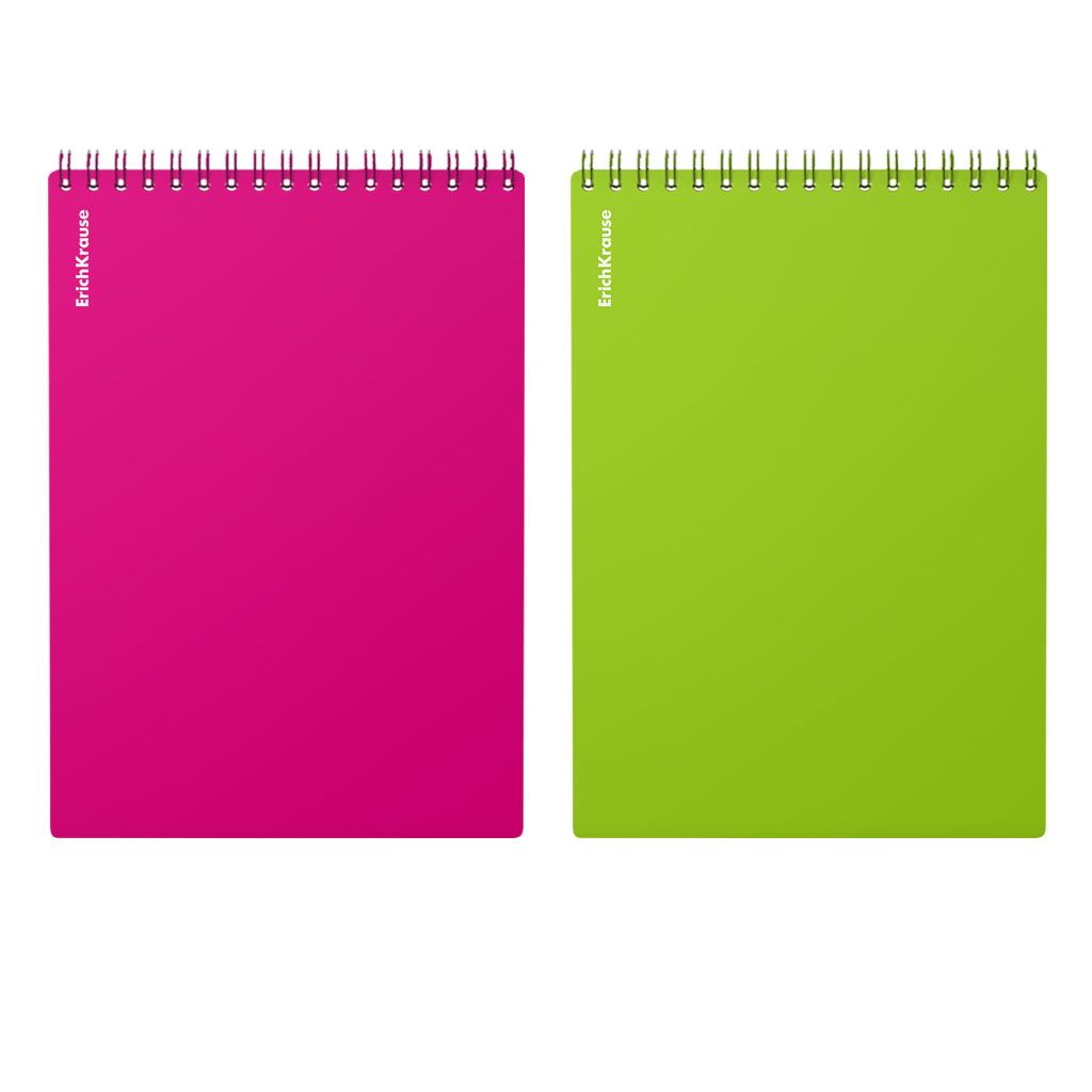 Блокнот формата А5 (148х210 мм). Обложка из высококачественного износостойкого матового пластика с фактурой песок. В блоке 80 листов в клетку. Бумага офсетная плотностью 60 г/м2. Цвет линовки - синий. Скругленные уголки обложки. Тип скрепления - спираль. Блокноты разного цвета упакованы в термоусадочную пленку по 2 штуки.