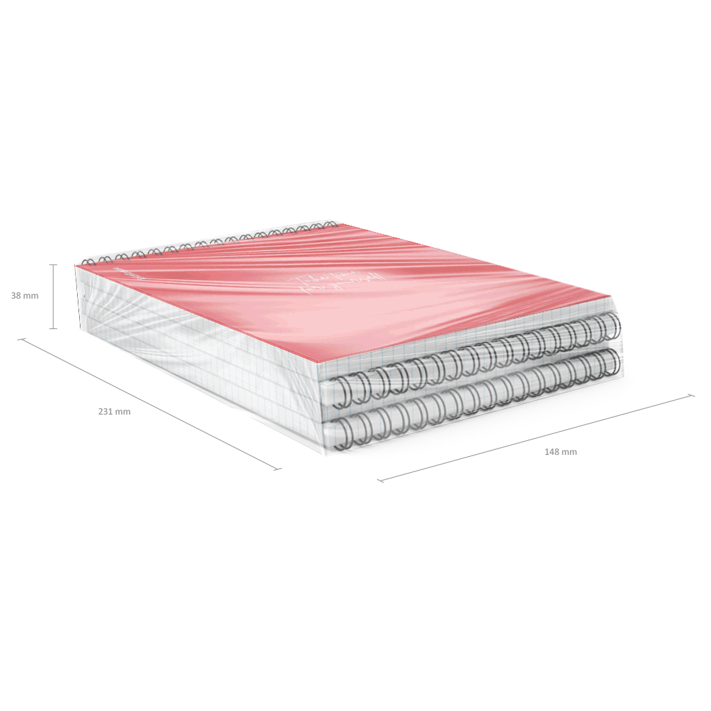 Блокнот формата А5 (148х210 мм). Обложка из высококачественного износостойкого матового пластика с фактурой песок. Стильный дизайн выполнен печатью белой краской. В блоке 80 листов в клетку. Бумага офсетная плотностью 60 г/м2. Цвет линовки - синий. Скругленные уголки обложки. Тип скрепления - спираль. Блокноты упакованы в термоусадочную пленку по 4 штуки.