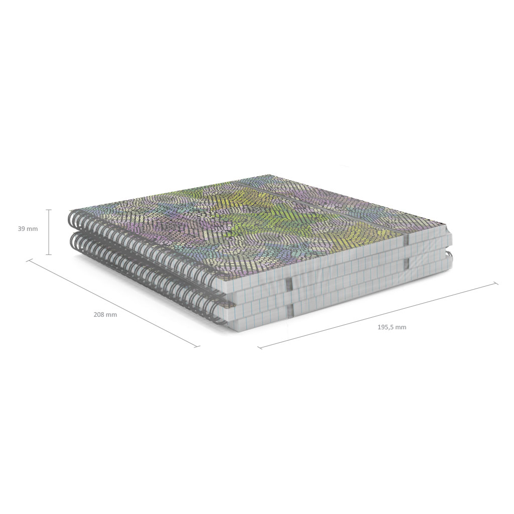 Тетрадь общая формата А5+ (170х205 мм). Обложка из высококачественного износостойкого матового пластика с фактурой песок. Эффектный стильный дизайн выполнен офсетной печатью яркими красками. В блоке 80 листов в клетку. Бумага офсетная плотностью 55 г/м2. Цвет линовки - синий. Скругленные уголки обложки. Обложка фиксируется прочной эластичной резинкой. Тип скрепления - спираль. Тетради упакованы в термоусадочную пленку по 4 штуки.