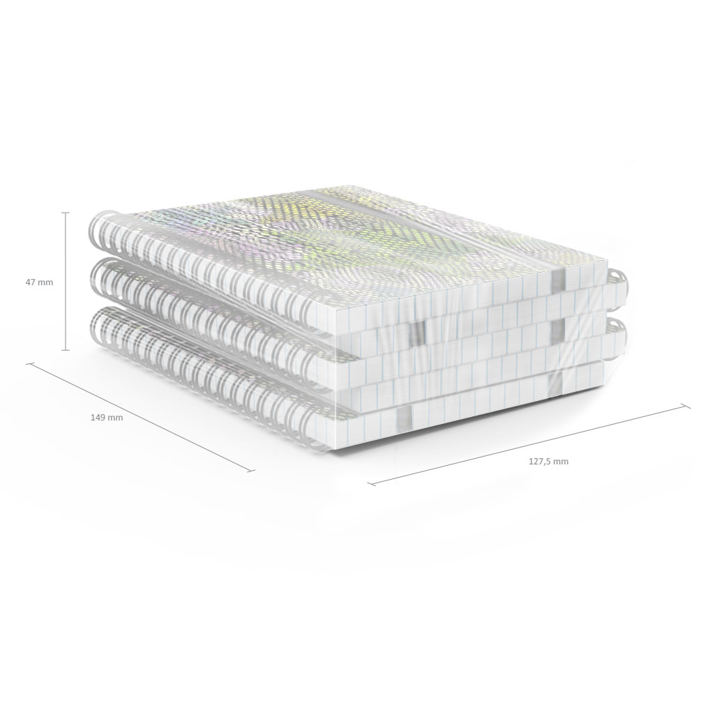 Тетрадь общая формата А6 (102x146 мм). Обложка из высококачественного износостойкого матового пластика с фактурой песок. Эффектный стильный дизайн выполнен офсетной печатью яркими красками. В блоке 80 листов в клетку. Бумага офсетная плотностью 55 г/м2. Цвет линовки - синий. Скругленные уголки обложки. Обложка фиксируется прочной эластичной резинкой. Тип скрепления - спираль. Тетради упакованы в термоусадочную пленку по 5 штук.