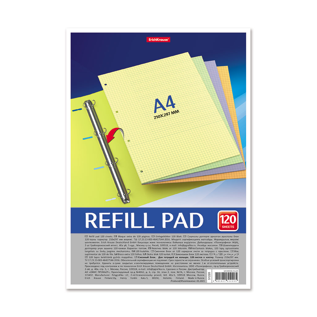 Сменный блок для тетрадей на кольцах формата А4 (210х297 мм). Благодаря плотной верхней обложке блок не деформируется. 120 листов в клетку. 4 цвета по 30 листов. Бумага офсетная плотностью 65 г/м2. Цвет линовки - синий. Перфорация под кольца. Имеет индивидуальную упаковку в термоусадочную пленку.