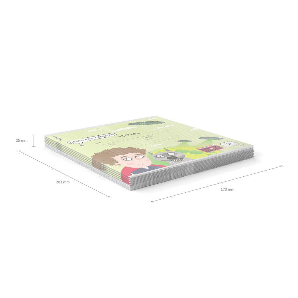 Тетрадь школьная ученическая формата А5+ (170х203 мм). Обложка из высококачественного мелованного картона плотностью 180 г/м2. В блоке 12 листов в линейку с полями. Бумага офсетная плотностью 60 г/м2. Цвет линовки - синий. Скругленные уголки обложки и блока. Тип скрепления - скоба. Тетради упакованы в термоусадочную пленку по 10 штук.