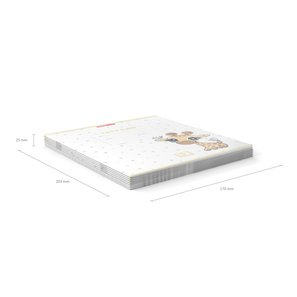 Тетрадь школьная ученическая формата А5+ (170х203 мм). Обложка из высококачественного мелованного картона плотностью 180 г/м2. В блоке 12 листов в клетку с полями. Бумага офсетная плотностью 60 г/м2. Цвет линовки - синий. Скругленные уголки обложки и блока. Тип скрепления - скоба. Тетради упакованы в термоусадочную пленку по 10 штук.