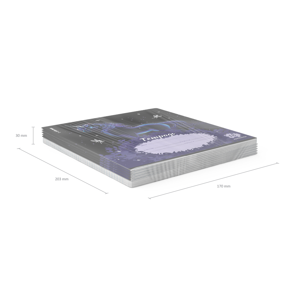 Тетрадь школьная ученическая формата А5+ (170х203 мм). Обложка из высококачественного мелованного картона плотностью 170 г/м2. Отделка обложки - выборочный УФ-лак. В блоке 18 листов в линейку с полями. Бумага офсетная плотностью 60 г/м2. Цвет линовки - синий. Скругленные уголки обложки и блока. Тип скрепления - скоба. Тетради разных цветов упакованы в термоусадочную пленку по 10 штук.