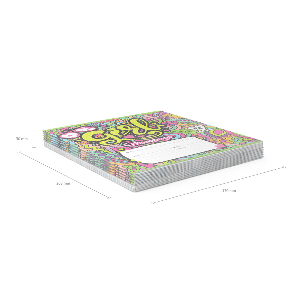 Тетрадь школьная ученическая формата А5+ (170х203 мм). Обложка из высококачественного мелованного картона плотностью 180 г/м2. В блоке 18 листов в клетку с полями. Бумага офсетная плотностью 60 г/м2. Цвет линовки - синий. Скругленные уголки обложки и блока. Тип скрепления - скоба. Тетради одного дизайна упакованы в термоусадочную пленку по 10 штук.