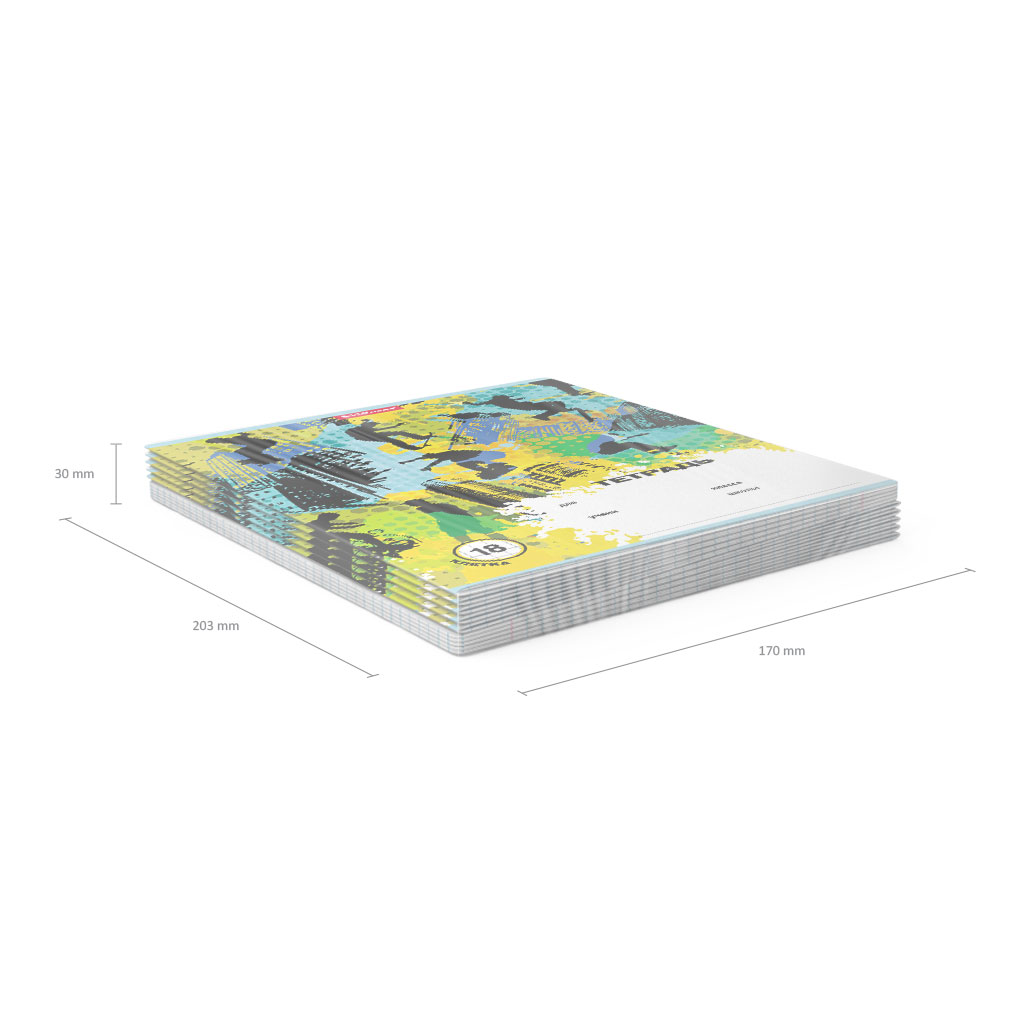 Тетрадь школьная ученическая формата А5+ (170х203 мм). Обложка из высококачественного мелованного картона плотностью 180 г/м2. В блоке 18 листов в клетку с полями. Бумага офсетная плотностью 60 г/м2. Цвет линовки - синий. Скругленные уголки обложки и блока. Тип скрепления - скоба. Тетради одного дизайна упакованы в термоусадочную пленку по 10 штук.
