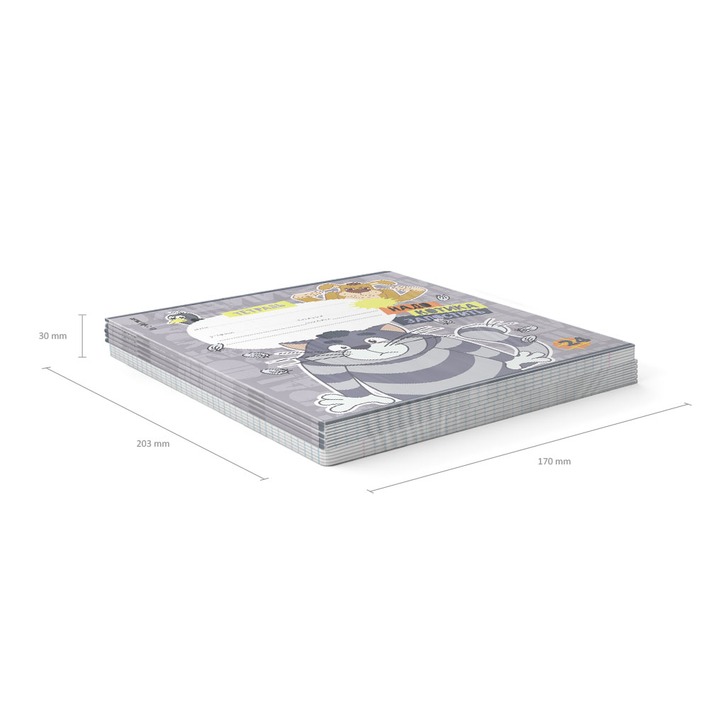 Тетрадь школьная ученическая формата А5+ (170х203 мм). Обложка из высококачественного мелованного картона плотностью 170 г/м2. В блоке 24 листа в клетку с полями. Бумага офсетная плотностью 60 г/м2. Цвет линовки - синий. Скругленные уголки обложки и блока. Тип скрепления - скоба. Тетради разного дизайна упакованы в термоусадочную пленку по 10 штук.