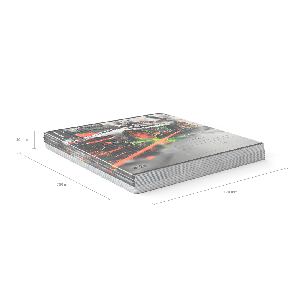 Тетрадь школьная ученическая формата А5+ (170х203 мм). Обложка из высококачественного мелованного картона плотностью 170 г/м2. В блоке 24 листа в линейку с полями. Бумага офсетная плотностью 60 г/м2. Цвет линовки - синий. Скругленные уголки обложки и блока. Тип скрепления - скоба. Тетради разного дизайна упакованы в термоусадочную пленку по 10 штук.