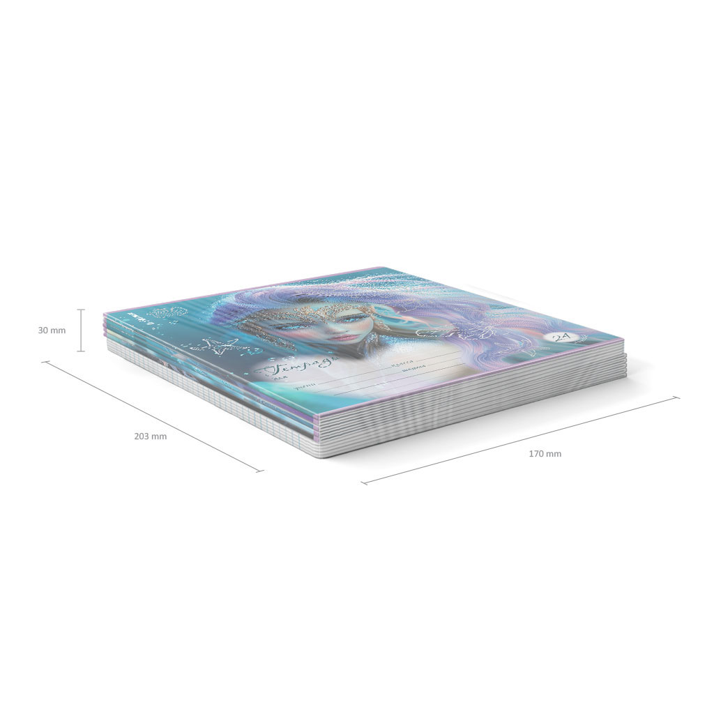 Тетрадь школьная ученическая формата А5+ (170х203 мм). Обложка из высококачественного мелованного картона плотностью 170 г/м2. Отделка обложки - выборочный УФ-лак с глиттером. В блоке 24 листа в линейку с полями. Бумага офсетная плотностью 60 г/м2. Цвет линовки - синий. Скругленные уголки обложки и блока. Тип скрепления - скоба. Тетради разного дизайна упакованы в термоусадочную пленку по 10 штук.
