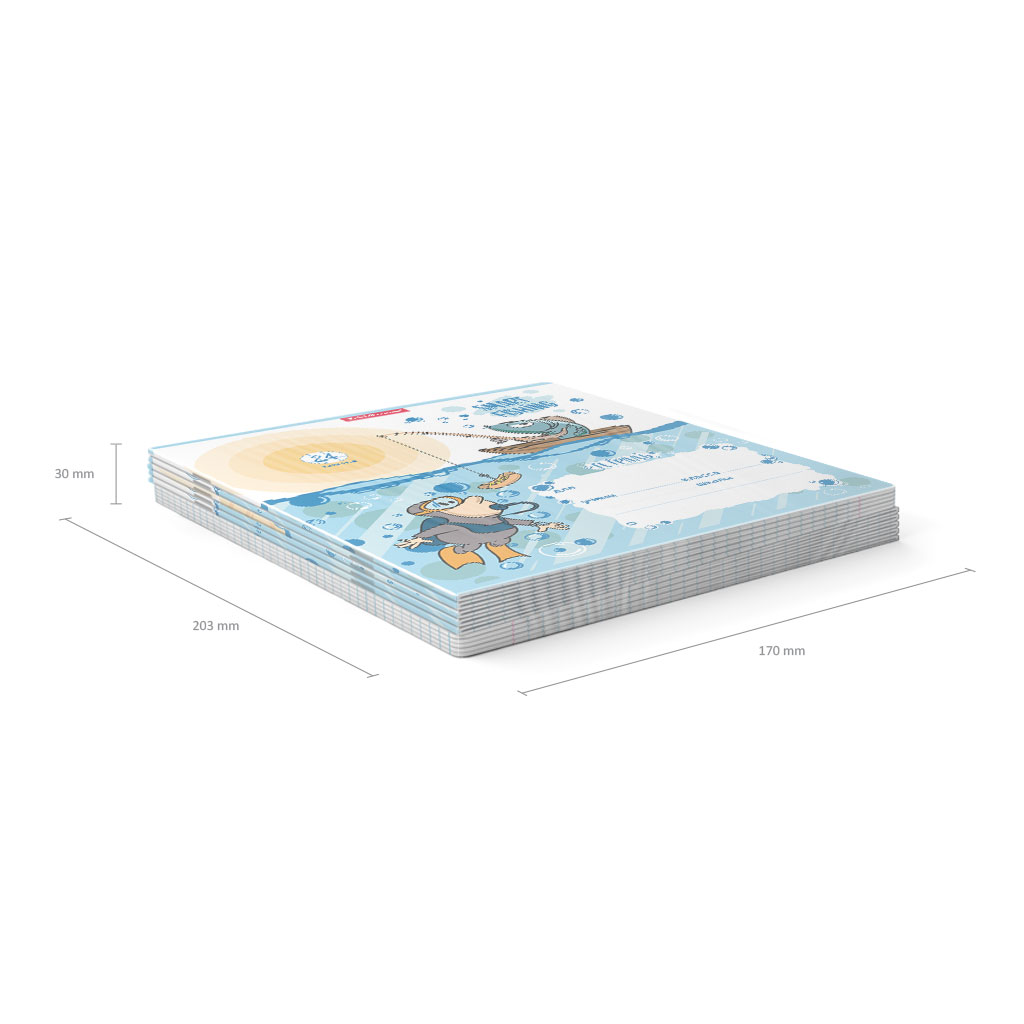 Тетрадь школьная ученическая формата А5+ (170х203 мм). Обложка из высококачественного мелованного картона плотностью 180 г/м2. В блоке 24 листа в клетку с полями. Бумага офсетная плотностью 60 г/м2. Цвет линовки - синий. Скругленные уголки обложки и блока. Тип скрепления - скоба. Тетради упакованы в термоусадочную пленку по 10 штук.