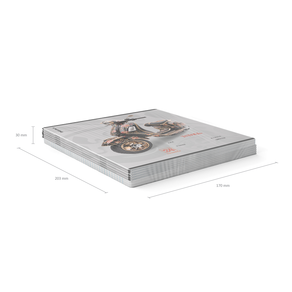 Тетрадь школьная ученическая формата А5+ (170х203 мм). Обложка из высококачественного мелованного картона плотностью 170 г/м2. В блоке 24 листа в линейку с полями. Бумага офсетная плотностью 60 г/м2. Цвет линовки - синий. Скругленные уголки обложки и блока. Тип скрепления - скоба. Тетради разного дизайна упакованы в термоусадочную пленку по 10 штук.