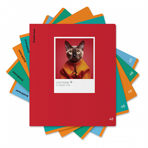 Тетрадь общая ученическая формата А5+ (170х203 мм). Обложка из высококачественного мелованного картона плотностью 190 г/м2. Отделка - матовая ламинация, выборочный УФ-лак. В блоке 48 листов в клетку с полями. Бумага офсетная плотностью 60 г/м2. Цвет линовки - синий. Скругленные уголки обложки и блока. Тип скрепления - скоба. Тетради разного дизайна упакованы в термоусадочную пленку по 5 штук.