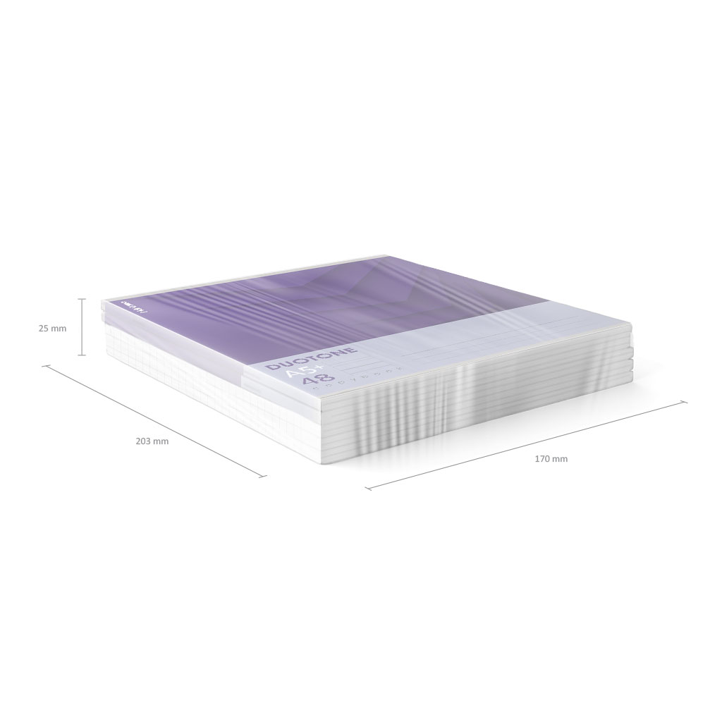 Тетрадь общая формата А5+ (170х203 мм). Обложка из высококачественного мелованного картона плотностью 190 г/м2. В блоке 48 листов в линейку с полями. Бумага офсетная плотностью 60 г/м2. Цвет линовки - синий. Скругленные уголки обложки и блока. Тип скрепления - скоба. Тетради разных цветов упакованы в термоусадочную пленку по 5 штук.
