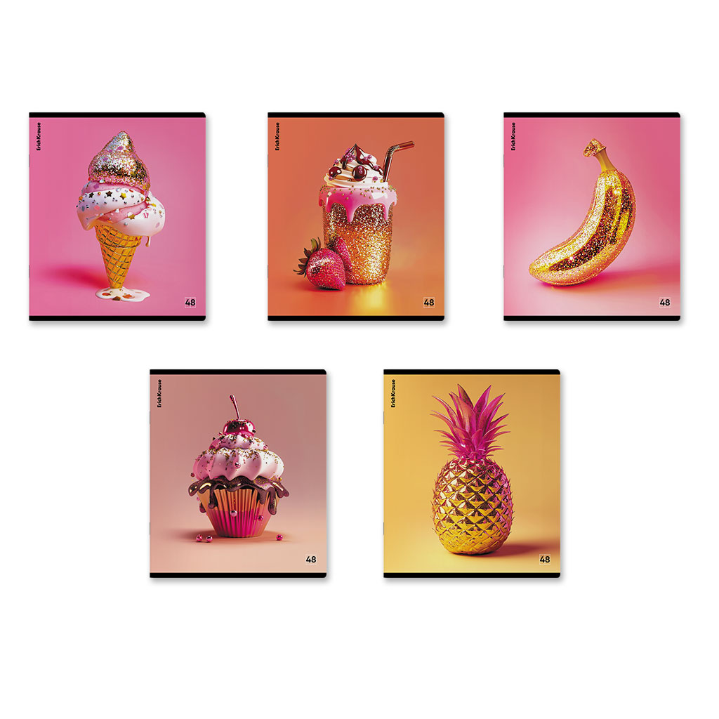 Тетрадь общая ученическая формата А5+ (170х203 мм). Обложка из высококачественного мелованного картона плотностью 190 г/м2. Отделка - матовая ламинация, выборочный УФ-лак. В блоке 48 листов в клетку с полями. Бумага офсетная плотностью 60 г/м2. Цвет линовки - синий. Скругленные уголки обложки и блока. Тип скрепления - скоба. Тетради разного дизайна упакованы в термоусадочную пленку по 5 штук.