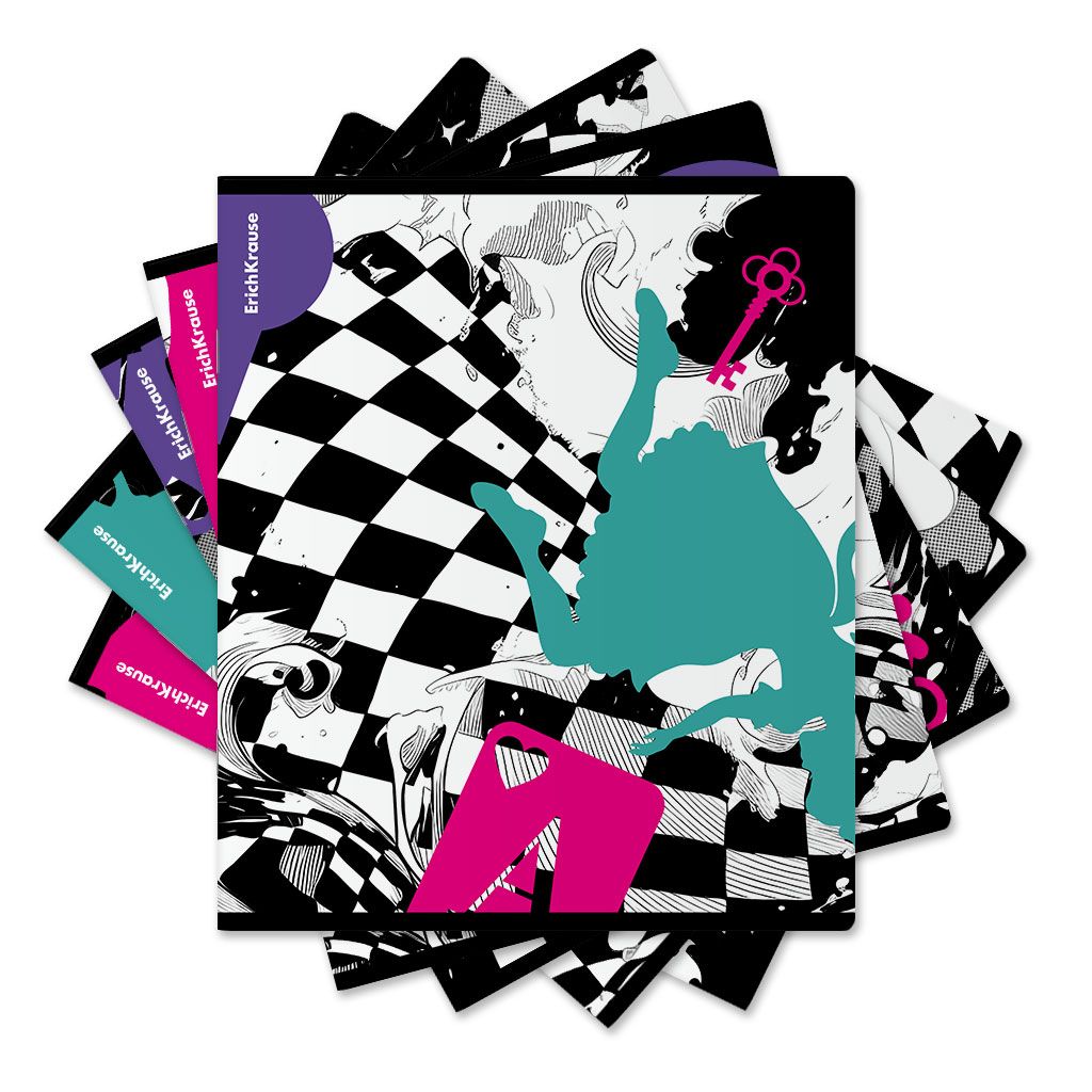 Тетрадь общая ученическая формата А5+ (170х203 мм). Обложка из высококачественного мелованного картона плотностью 190 г/м2. Отделка - матовая ламинация, выборочный УФ-лак. В блоке 48 листов в клетку с полями. Бумага офсетная плотностью 60 г/м2. Цвет линовки - синий. Скругленные уголки обложки и блока. Тип скрепления - скоба. Тетради разного дизайна упакованы в термоусадочную пленку по 5 штук.