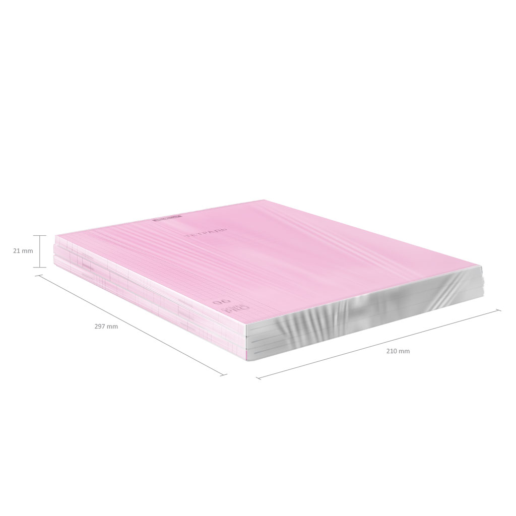 Тетрадь общая ученическая формата А4 (210x297 мм). Двойная обложка: внешняя выполнена из высококачественного износостойкого цветного глянцевого пластика с фактурой зеркало, внутренняя из офсетной бумаги. В блоке 96 листов в клетку. Бумага офсетная плотностью 60 г/м2. Цвет линовки синий. Скругленные уголки обложки и блока. Тип скрепления скоба. Тетради упакованы в термоусадочную пленку по 5 штук.