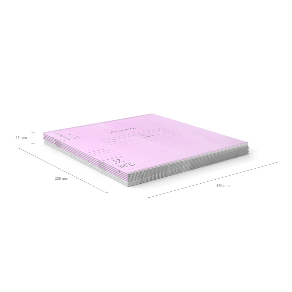 Тетрадь школьная ученическая формата А5+ (170x203 мм). Двойная обложка: внешняя выполнена из высококачественного износостойкого цветного пластика с фактурой апельсиновая корка, внутренняя из офсетной бумаги. В блоке 12 листов в линейку. Бумага офсетная плотностью 60 г/м2. Цвет линовки синий. Скругленные уголки обложки и блока. Тип скрепления скоба. Тетради упакованы в термоусадочную пленку по 10 штук.