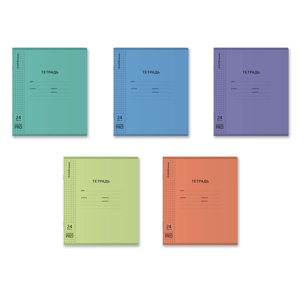 Тетрадь школьная ученическая формата А5+ (170x203 мм). Двойная обложка: внешняя выполнена из высококачественного износостойкого цветного пластика с фактурой песок, внутренняя из офсетной бумаги. В блоке 24 листа в клетку. Бумага офсетная плотностью 60 г/м2. Цвет линовки синий. Скругленные уголки обложки и блока. Тип скрепления скоба. 10 тетрадей пяти разных цветов упакованы в термоусадочную пленку по 2 штуки каждого цвета.