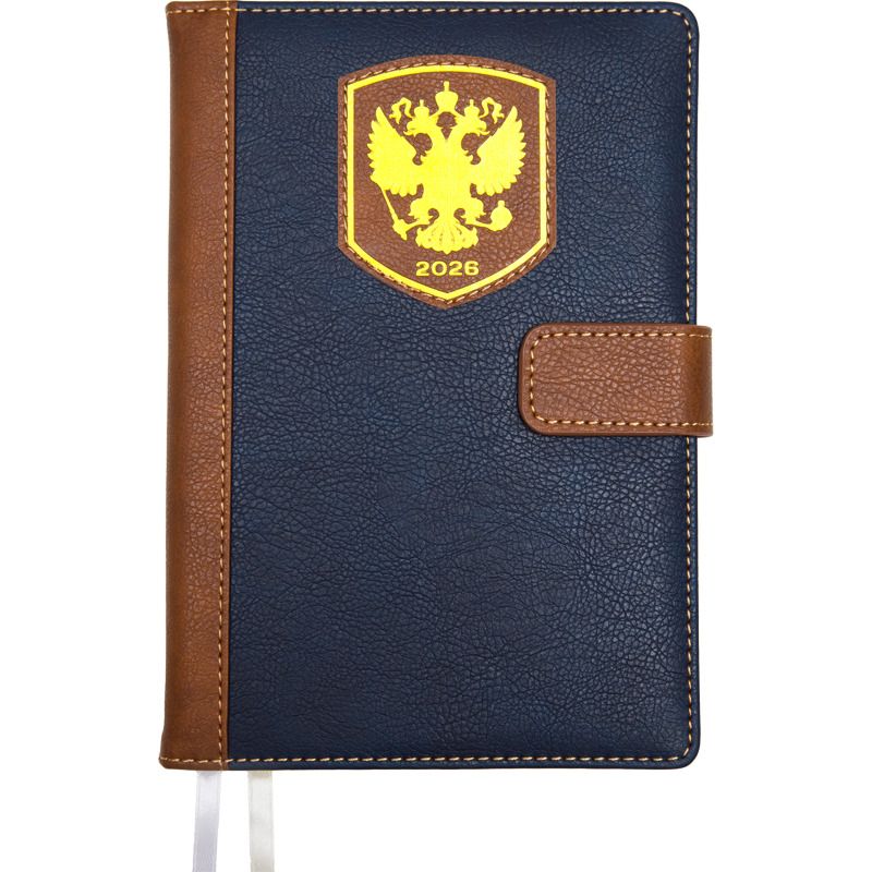 Ежедневник датированный 2026 "deVENTE. Blazon" A5 (145 ммx205 мм) 352 стр, кремовая бумага 70 г/м, печать в 2 краски, твердая комбинированная обложка из искусственной кожи с поролоном, магнитная застежка, аппликация, тиснение фольгой, перфорация, закругленные уголки, 2 ляссе, в подарочной коробке, синий с коричневым