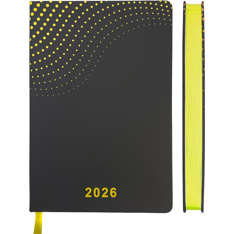 Ежедневник датированный 2026 "deVENTE. Duo" A5 (145 ммx205 мм) 336 стр, белая бумага 70 г/м с желтым срезом, печать в 2 краски, твердая обложка из искусственной кожи, шелкография, перфорация, закругленные уголки, 2 ляссе, в термоусадочной пленке, черный с желтым
