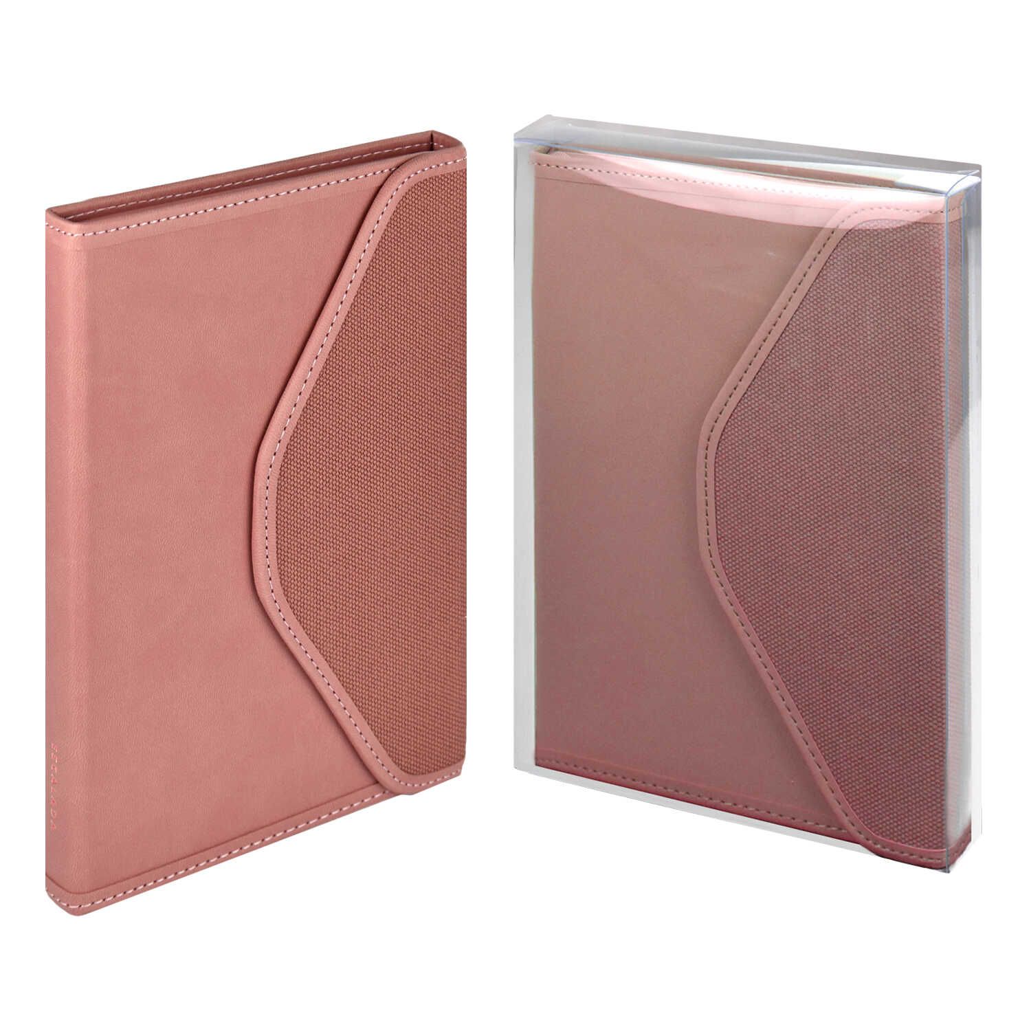 Ежедневник недатированный ESCALADA, А5+, 160 л., арт. 67161/ 10 ПИКЕ РОЗОВЫЙ (кожзам: 155х220 мм, твёрдый переплёт, материал обложки: искусственная кожа "Лейкер", искусственная кожа "Пике"; способ крепления блока: ниткошвейный; декор: обстрочка обложки по периметру нитками в цвет переплётного материала, сочетание двух переплетных материалов, тиснение фольгой; вн. блок: 160 л., кремовый офсет 70 г/м, печать в одну краску (линия), справочный материал: есть; перфорация углов блока: нет; закладка/-и: два ляссе, каптал: есть; форзац: печать пантоном, особенности: магнитный клапан; персонализация возможна: да; индивидуальная упаковка: ПВХ-коробка + промостикер + ПЭТ-пакет)