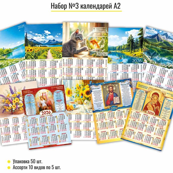 Календарь листовой 420*594мм на 2026г. Ассорти. 10в.по 5шт.