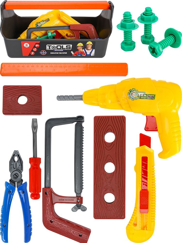 Набор инструментов "Юный мастер" понравится любому ребенку! Развивает мышление и мелкую моторику. В наборе 13 предметов: 3 болта, 3 гайки, отвертка, 2 дощечки, пасатижи, линейка, дрель механическая, канцелярский нож выдвижной. Размер игрушки 27*13*12,5 см. В ящике, размер: 29х13х13,5 см.