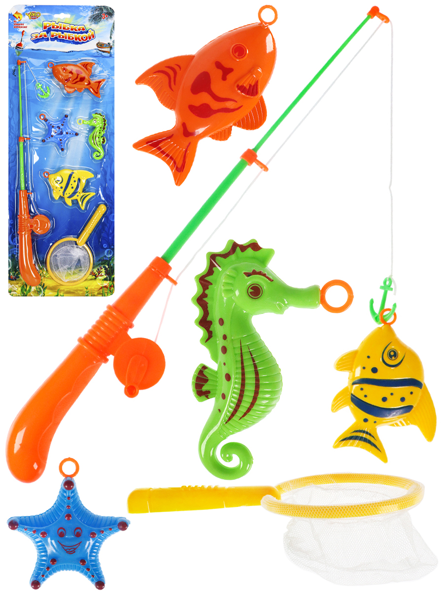 Пластиковая рыбалка с крючком позволит малышу заняться увлекательной ловлей морских обитателей. Такая увлекательная игра поможет развить координацию движений, ловкость, воображение, внимание и усидчивость. Все детали изготовлены из высококачественного пластика, абсолютно безопасного для детей. В комплект входят 6 предметов: 2 рыбки с принтованым окрасом , морская звезда, морской конёк, удочка телескопическая (2 колена), сачок. Длина удочки составляет 41 см. На оборотной стороне карты - раскраска с рассказом о морских обитателях. Размер: 20*50 см.